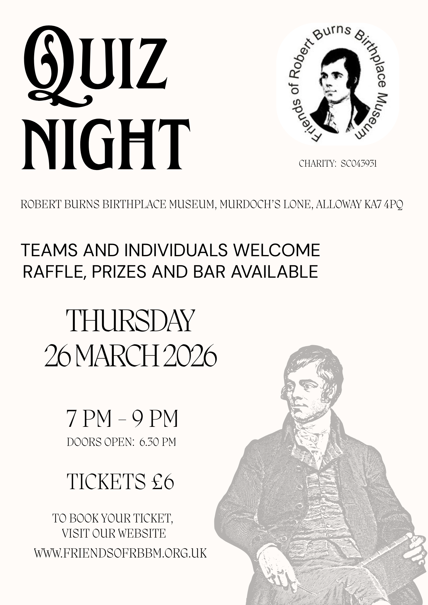 Date: Thursday 26th of March Place: The Robert Burns Birthplace Museum, Murdoch’s Lone, Alloway, Ayr, KA7 4PQ Time: 7-9pm (Doors open at 6.30 pm) Tickets: £6 per person Teams (maximum 6 per team) and individuals welcomed Raffle, prizes and bar available on the evening Money raised by the Friends will be used to fund specific projects on the site. Tickets can be reserved and paid for online. Please select the number of tickets and pay using the Pay button below. You can use your credit or debit card or use your PayPal account if you have one. Please complete the Contact details form below so we can email you the ticket(s) once payment has been processed. Please contact us at info@friendsofrbbm.org.uk if you have any questions regarding this event.